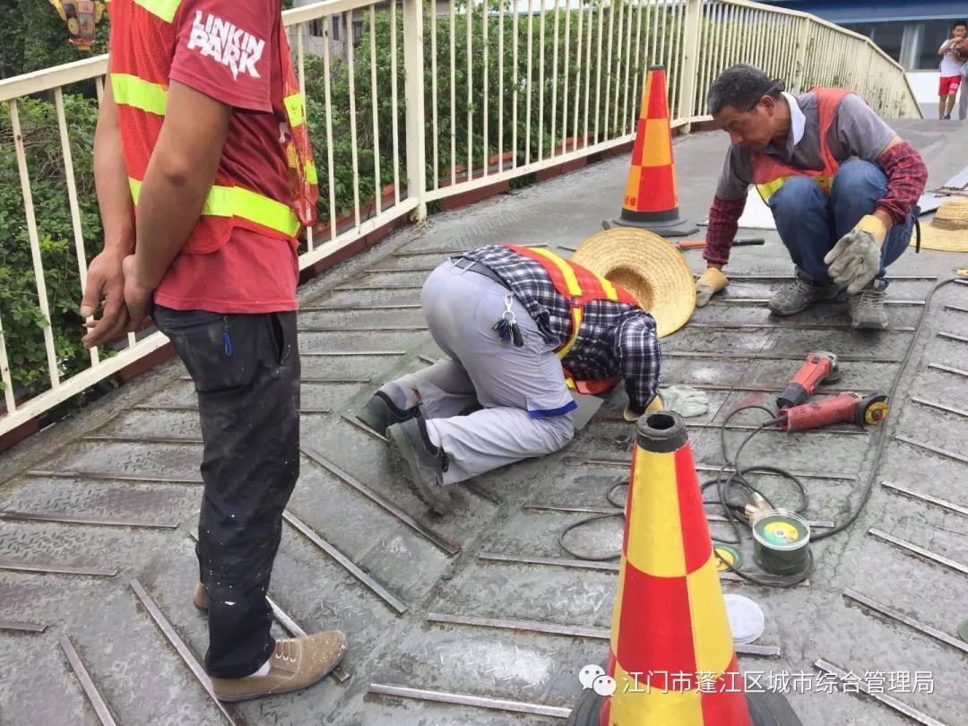 近期,體育場天橋的管養(yǎng)單位——蓬江區(qū)市政設施管理監(jiān)督站針對該天橋爬梯踏步和主跨鋼板銹蝕、防滑花紋磨損嚴重,橋面摩阻系數偏低,行人行走時易滑到,存在一定安全隱患的實際情況,制定了切實可行的維修養(yǎng)護方案。