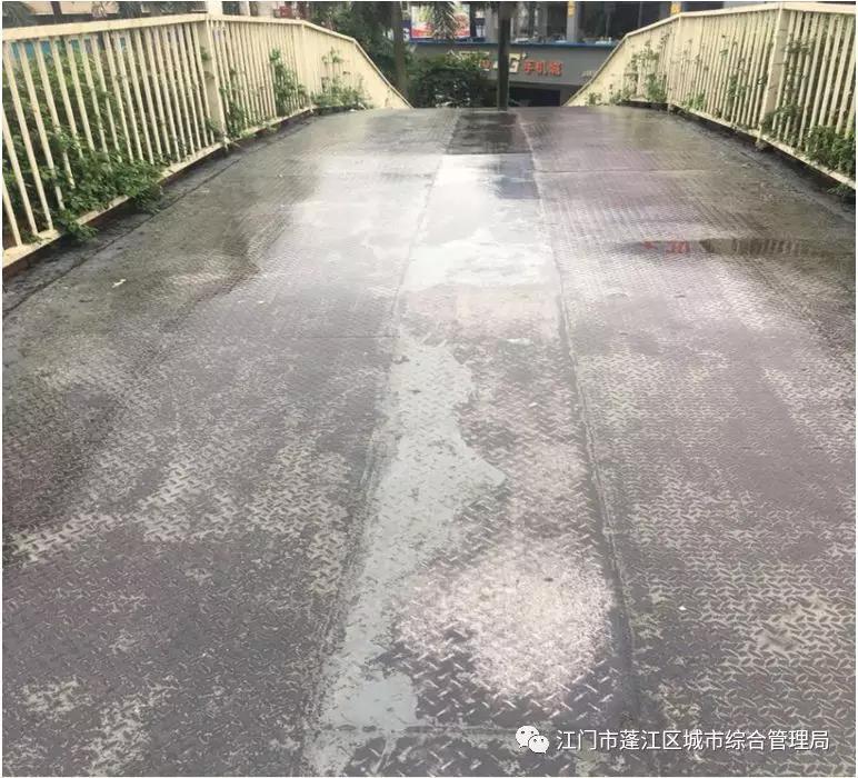始建于1989年的江門市體育場天橋使用至今近30年,由于地處交通繁忙、人流密集的蓬江區(qū)躍進路,該天橋的使用頻率和使用強度非常高,從而造成橋面磨損也非常嚴重。