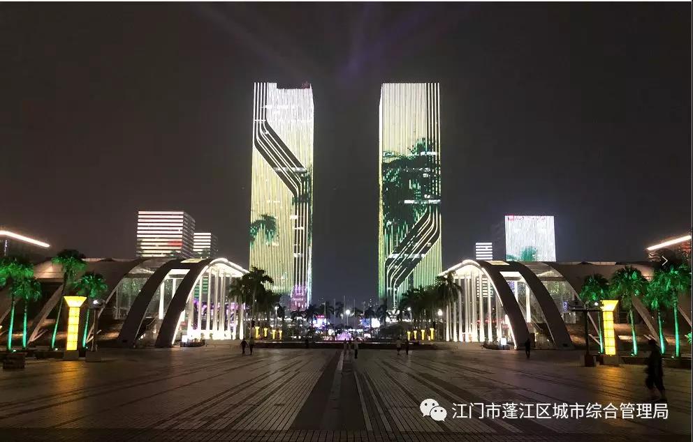 打造以院士路為軸線的城市中央活動區(qū),這是2018年江門市蓬江區(qū)的城市亮化工程首期項目,也是重點項目。主要在華僑廣場及萬達廣場周邊(含元寶山公園、發(fā)展大道、院士路、篁莊大道及白石大道)重點區(qū)域樓宇制作聯(lián)動燈光秀,與周邊樓宇多媒體立面互聯(lián)互動,在彩色激光燈、音樂噴泉以及立體聲音響的渲染下,營造出具有沖擊力的光、影、聲互動輝映的場景,把城區(qū)打造出一個流光溢彩、美輪美奐的城市夜景。