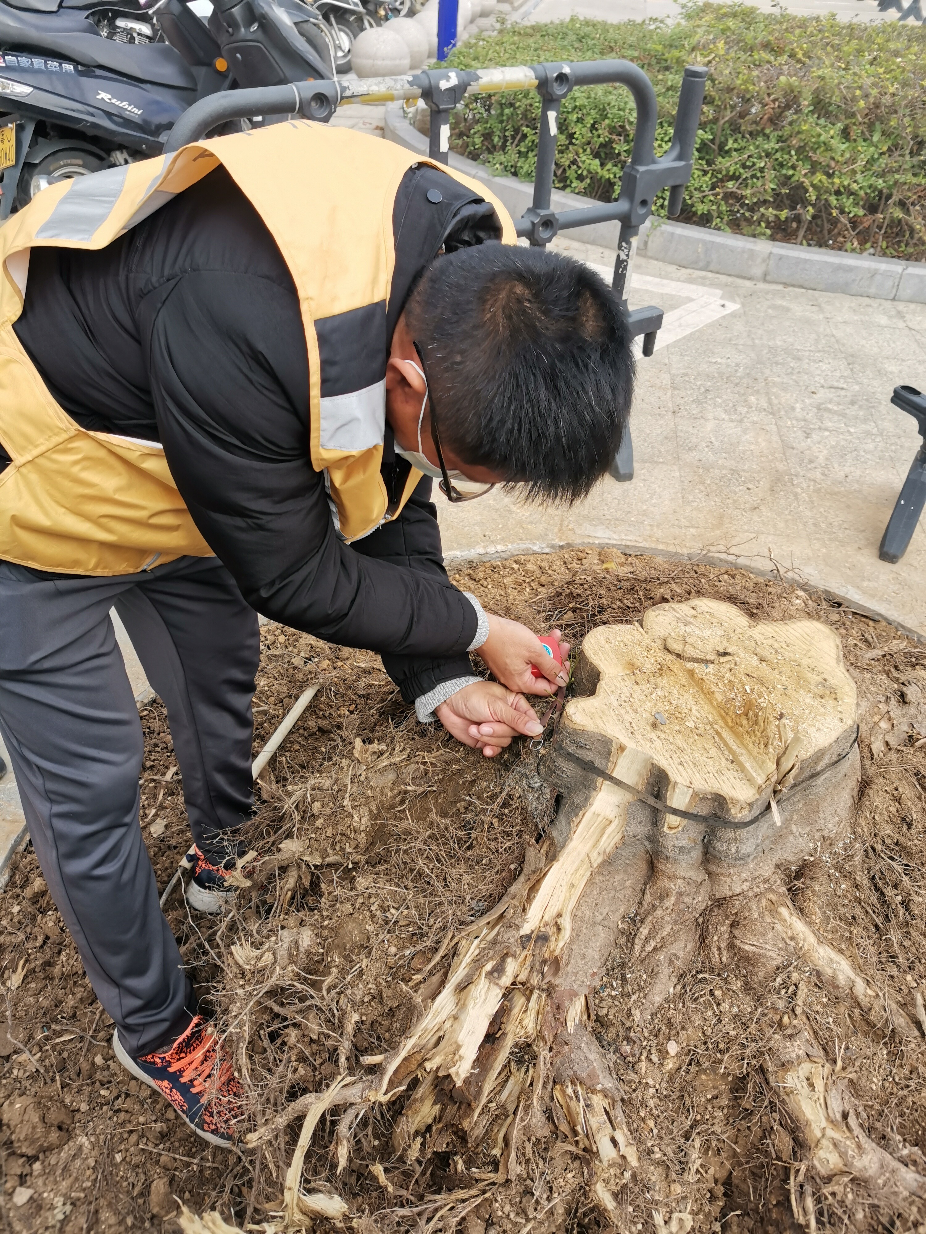 由于樹干已被清運,無法測量樹木胸徑。為了查清事實,執(zhí)法人員來到物業(yè)管理處進一步詢問樹木的詳細情況,并根據樹木頭徑及旁邊同期種植的同品種樹木作為數(shù)值參考,經現(xiàn)場檢查、詢問、拍攝取證等一系列查證措施,確定該樹木為2016年種植的細葉欖仁。執(zhí)法人員對違法事實進行了進一步鎖定確認,并依法進行處罰。