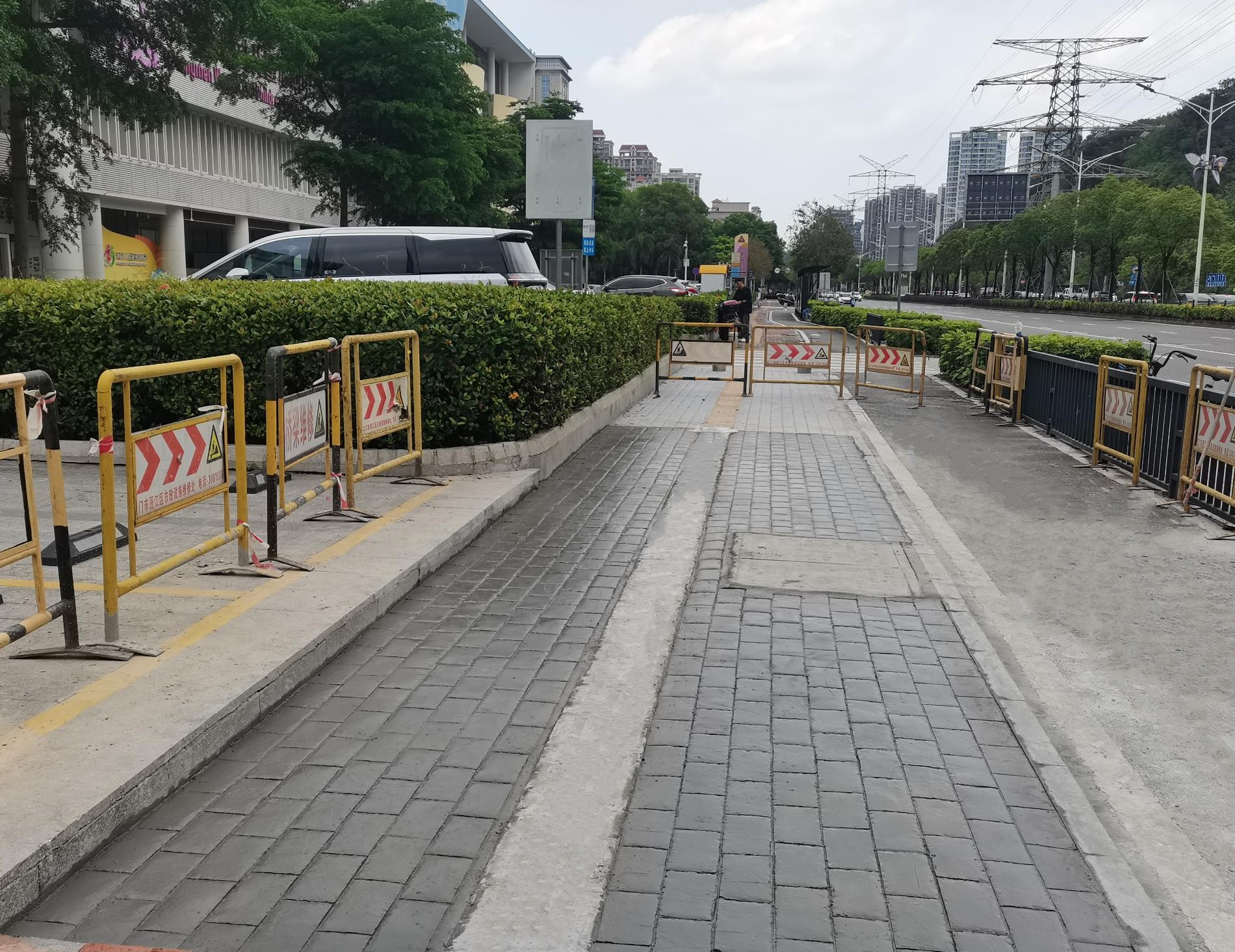 修復(fù)后的豐樂路人行道路面,養(yǎng)護期間做好圍蔽措施