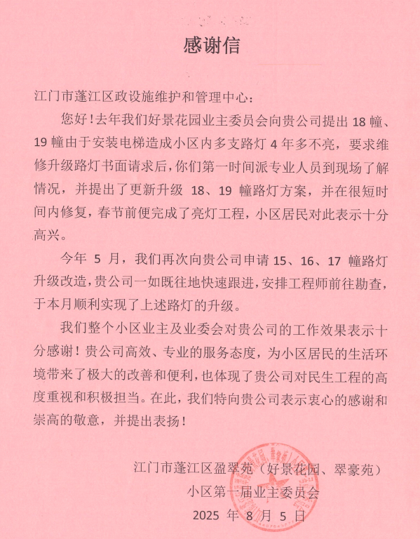 “政府真心辦實(shí)事,這盞燈照亮的不止是回家的路,更是咱老百姓的心!”近日,蓬江區(qū)盈翠苑等小區(qū)居民代表莫叔和梁叔手持感謝信,紙短情長(zhǎng),感謝該局為民辦實(shí)事、解民憂,高效解決小區(qū)百余戶居民夜間安全出行難題。這既是群眾對(duì)城管工作的肯定,更彰顯政府部門對(duì)民生工程的高度重視與主動(dòng)擔(dān)當(dāng),始終把群眾的“急難愁盼”放在心上、抓在手上,用實(shí)實(shí)在在的舉措把民生實(shí)事辦進(jìn)群眾心坎里,生動(dòng)踐行“人民城市為人民”的發(fā)展思想。