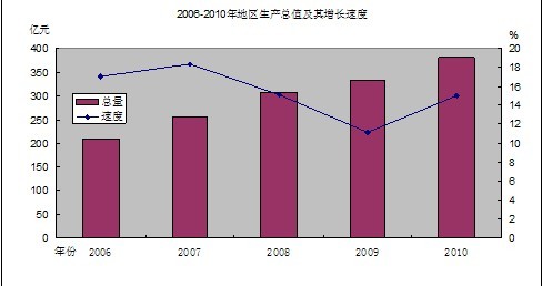 初步核算,2010年全區(qū)生產(chǎn)總值(GDP)380.53億元,按可比價格計算,比上年增長15%。其中,第一產(chǎn)業(yè)增加值7.22億元,下降0.2%;第二產(chǎn)業(yè)增加值211.34億元,增長17.6%,對GDP貢獻率為68.15%;第三產(chǎn)業(yè)增加值161.97億元,增長11.8%,對GDP貢獻率為31.88%。在第三產(chǎn)業(yè)增加值中,交通運輸、倉儲和郵政業(yè)增長7.8%,批發(fā)和零售業(yè)增長13.3%,住宿和餐飲業(yè)增長8.5%,金融業(yè)增長2.7%,房地產(chǎn)業(yè)增長3.9%,其他服務業(yè)增長15.47%。三產(chǎn)產(chǎn)業(yè)結(jié)構(gòu)的比例為1.9:55.54:42.56。