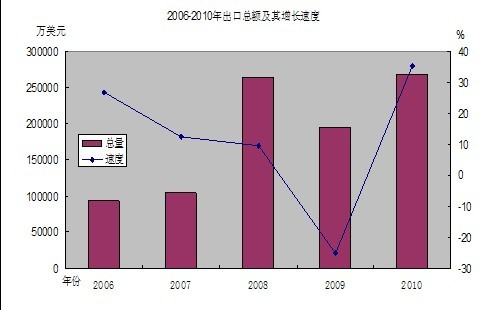 全年進出口總額33.22億美元,增長38.37%,其中,出口總額26.84億美元,增長35.29%;進口總額6.37億美元,增長53.02%。出口貿(mào)易中,一般貿(mào)易出口21.74億美元,增長34.9%;加工貿(mào)易出口5.1億美元,增長36.81%。從各種經(jīng)濟類型企業(yè)出口情況看,國有企業(yè)出口1042萬美元,下降84.63%;三資企業(yè)出口8.74億元,增長34.21%;私營企業(yè)出口18億美元,增長42.27%。