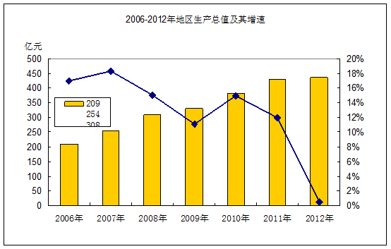 初步核算,2012年全區(qū)實現(xiàn)地區(qū)生產(chǎn)總值(GDP)438.26億元,同比增長0.5%。其中,第一產(chǎn)業(yè)增加值8.63億元,下降0.2%;第二產(chǎn)業(yè)增加值240.54億元,同比下降3.3%;第三產(chǎn)業(yè)增加值189.09億元,同比增長6.5%。三次產(chǎn)業(yè)結構為1.97:54.88:43.15。在第三產(chǎn)業(yè)增加值中,批發(fā)和零售業(yè)增長1.5%,住宿和餐飲業(yè)增長1.7%,金融業(yè)增長14.7%,房地產(chǎn)業(yè)增長4.7%。人均GDP60518元,增長0.07%。