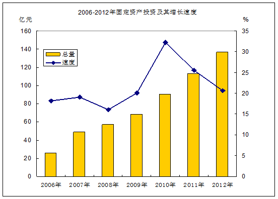 全年固定資產(chǎn)投資 136.33 億元,比上年增長20.61%。分經(jīng)濟類型看,國有、集體經(jīng)濟投資39.71億元,增長83.67%;外資經(jīng)濟投資25.03億元,下降2.34%;民營經(jīng)濟投資71.59億元,增長8.83%;分產(chǎn)業(yè)看,第一產(chǎn)業(yè)投資0億元;第二產(chǎn)業(yè)投資38.37億元,增長9.28%;第三產(chǎn)業(yè)投資97.96億元,增長27.31%。