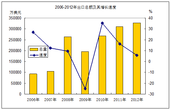 全年進出口總額407729 萬美元,比上年增長6.04%,其中,進口總額79721萬美元,增長7.73%;出口總額328009萬美元,增長5.64 %。出口貿(mào)易中,一般貿(mào)易出口 279878萬美元,增長6.73 %;加工貿(mào)易出口48061萬美元,增長0.17%。從各種經(jīng)濟類型企業(yè)出口情況看,國有企業(yè)出口133萬美元,下降 80.26%;三資企業(yè)出口108038萬美元,下降0.78%;私營企業(yè)出口219838萬美元,增長9.40%?!?/span>