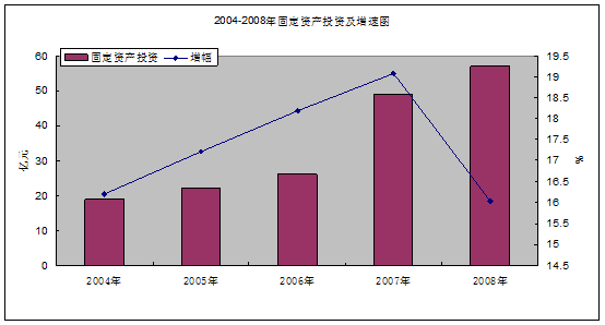 2008年實(shí)現(xiàn)全社會固定資產(chǎn)投資56.97億元,同比增長16.03%。其中基本建設(shè)投資9.06億元;更新改造投資8.4億元,同比增長57.6%;房地產(chǎn)開發(fā)投資38.78億元,同比增長79.19%。