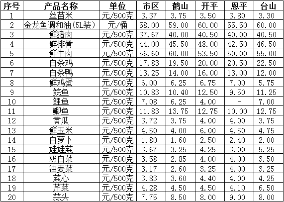 說明:1、表中價格為該地區(qū)監(jiān)測點綜合平均價;2、“市區(qū)”含蓬江區(qū)、江海區(qū)、新會區(qū),價格分別采自勝利市場、江南市場、城東市場等6家農(nóng)貿(mào)市場;3、其他四個縣市價格分別采自新鶴市場、南昌市場等8家農(nóng)貿(mào)市場。