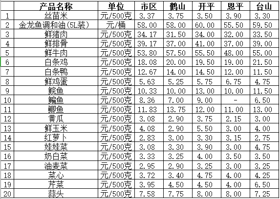 說(shuō)明:1、表中價(jià)格為該地區(qū)監(jiān)測(cè)點(diǎn)綜合平均價(jià);2、“市區(qū)”含蓬江區(qū)、江海區(qū)、新會(huì)區(qū),價(jià)格分別采自勝利市場(chǎng)、江南市場(chǎng)、城東市場(chǎng)等6家農(nóng)貿(mào)市場(chǎng);3、其他四個(gè)縣市價(jià)格分別采自新鶴市場(chǎng)、南昌市場(chǎng)等8家農(nóng)貿(mào)市場(chǎng)。