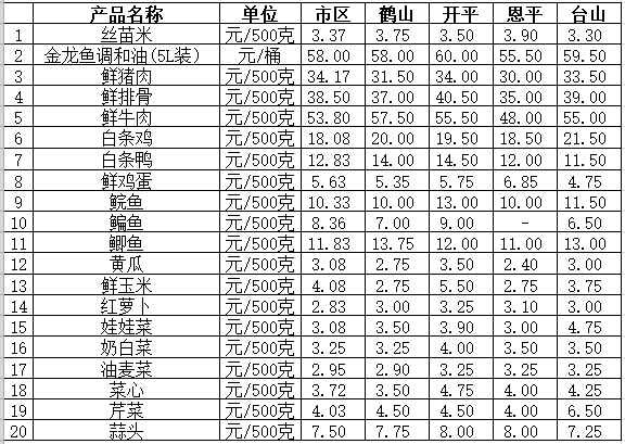 說明:1、表中價(jià)格為該地區(qū)監(jiān)測(cè)點(diǎn)綜合平均價(jià);2、“市區(qū)”含蓬江區(qū)、江海區(qū)、新會(huì)區(qū),價(jià)格分別采自勝利市場(chǎng)、江南市場(chǎng)、城東市場(chǎng)等6家農(nóng)貿(mào)市場(chǎng);3、其他四個(gè)縣市價(jià)格分別采自新鶴市場(chǎng)、南昌市場(chǎng)等8家農(nóng)貿(mào)市場(chǎng)。
