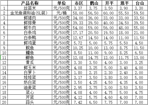 說(shuō)明:1、表中價(jià)格為該地區(qū)監(jiān)測(cè)點(diǎn)綜合平均價(jià);2、“市區(qū)”含蓬江區(qū)、江海區(qū)、新會(huì)區(qū),價(jià)格分別采自蓬江市場(chǎng)、江南市場(chǎng)、城東市場(chǎng)等6家農(nóng)貿(mào)市場(chǎng);3、其他四個(gè)縣市價(jià)格分別采自新鶴市場(chǎng)、錦江市場(chǎng)等8家農(nóng)貿(mào)市場(chǎng)。