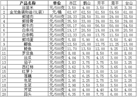 說明:1、表中價(jià)格為該地區(qū)監(jiān)測(cè)點(diǎn)綜合平均價(jià);2、“市區(qū)”含蓬江區(qū)、江海區(qū)、新會(huì)區(qū),價(jià)格分別采自蓬江市場(chǎng)、江南市場(chǎng)、城東市場(chǎng)等6家農(nóng)貿(mào)市場(chǎng);3、其他四個(gè)縣市價(jià)格分別采自新鶴市場(chǎng)、錦江市場(chǎng)等8家農(nóng)貿(mào)市場(chǎng)。