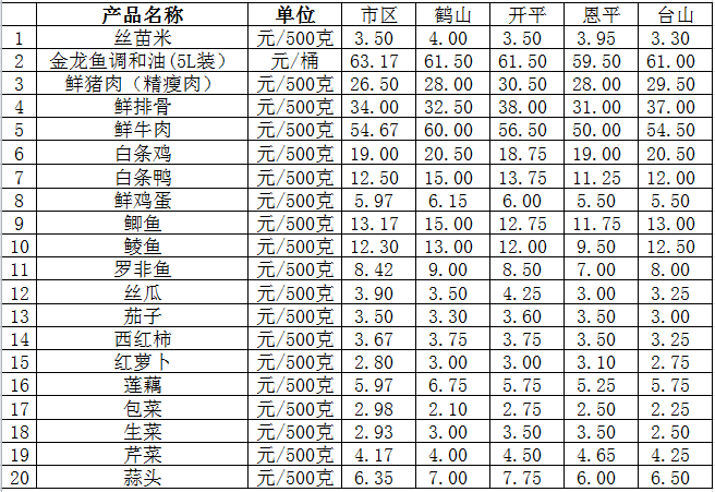說明:1、表中價格為該地區(qū)監(jiān)測點綜合平均價;2、“市區(qū)”含蓬江區(qū)、江海區(qū)、新會區(qū),價格分別采自蓬江市場、江南市場、城東市場等6家農(nóng)貿(mào)市場;3、其他四個縣市價格分別采自新鶴市場、錦江市場等8家農(nóng)貿(mào)市場。