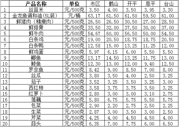 說明:1、表中價(jià)格為該地區(qū)監(jiān)測點(diǎn)綜合平均價(jià);2、“市區(qū)”含蓬江區(qū)、江海區(qū)、新會區(qū),價(jià)格分別采自蓬江市場、江南市場、城東市場等6家農(nóng)貿(mào)市場;3、其他四個(gè)縣市價(jià)格分別采自新鶴市場、錦江市場等8家農(nóng)貿(mào)市場。