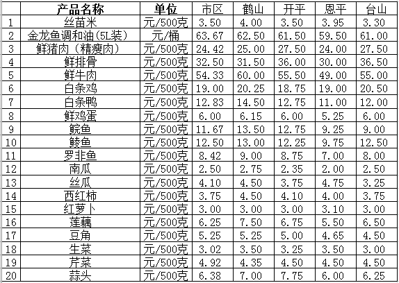 說明:1、表中價(jià)格為該地區(qū)監(jiān)測點(diǎn)綜合平均價(jià);2、“市區(qū)”含蓬江區(qū)、江海區(qū)、新會區(qū),價(jià)格分別采自蓬江市場、江南市場、城東市場等6家農(nóng)貿(mào)市場;3、其他四個(gè)縣市價(jià)格分別采自新鶴市場、錦江市場等8家農(nóng)貿(mào)市場。
