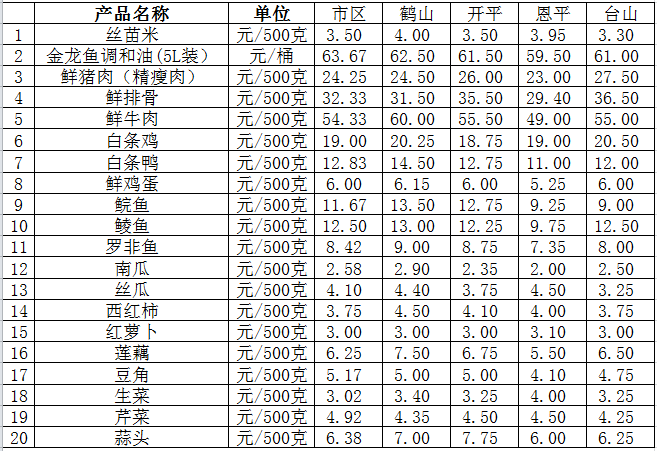 說明:1、表中價格為該地區(qū)監(jiān)測點綜合平均價;2、“市區(qū)”含蓬江區(qū)、江海區(qū)、新會區(qū),價格分別采自蓬江市場、江南市場、城東市場等6家農(nóng)貿(mào)市場;3、其他四個縣市價格分別采自新鶴市場、錦江市場等8家農(nóng)貿(mào)市場。