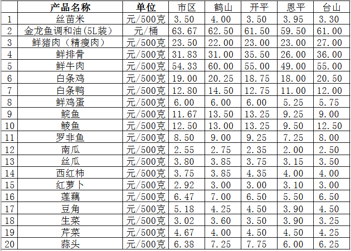 說明:1、表中價格為該地區(qū)監(jiān)測點綜合平均價;2、“市區(qū)”含蓬江區(qū)、江海區(qū)、新會區(qū),價格分別采自蓬江市場、江南市場、城東市場等6家農(nóng)貿(mào)市場;3、其他四個縣市價格分別采自新鶴市場、錦江市場等8家農(nóng)貿(mào)市場。