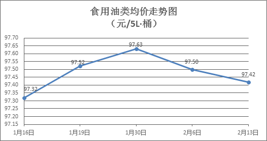 食用油類商品價(jià)格穩(wěn)中微降。本周所監(jiān)測(cè)的9種食用油(5L裝)商品價(jià)格波動(dòng)情況為3漲5跌1平,綜合零售均價(jià)為97.42元/桶,環(huán)比下降0.08%。其中:魯花花生油、大豆油零售均價(jià)分別為每桶159.15元、61.78元,環(huán)比分別下降0.06%、下降0.13%。