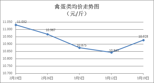 禽蛋類商品價(jià)格總體略升。本周所監(jiān)測(cè)的6種禽蛋類商品價(jià)格波動(dòng)情況為5漲1跌,綜合零售均價(jià)為10.928元/斤,環(huán)比上漲0.78%。其中:白條雞、白條鴨零售均價(jià)分別為每斤19.72元、15.27元,環(huán)比分別上漲0.36%、上漲1.60%;白殼雞蛋、鴨蛋零售均價(jià)分別為每斤6.93元、7.84元,環(huán)比分別下降1.28%、上漲1.29%。