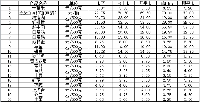 說明:1、表中價(jià)格為該地區(qū)監(jiān)測(cè)點(diǎn)綜合平均價(jià);2、“市區(qū)”含蓬江區(qū)、江海區(qū)、新會(huì)區(qū),價(jià)格分別采自蓬江市場(chǎng)、江南市場(chǎng)、城東市場(chǎng)等13家農(nóng)貿(mào)市場(chǎng);3、其他四個(gè)縣市價(jià)格分別采自新華市場(chǎng)、錦江市場(chǎng)等8家農(nóng)貿(mào)市場(chǎng)。