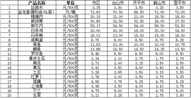 說明:1、表中價格為該地區(qū)監(jiān)測點綜合平均價;2、“市區(qū)”含蓬江區(qū)、江海區(qū)、新會區(qū),價格分別采自蓬江市場、江南市場、城東市場等13家農(nóng)貿(mào)市場;3、其他四個縣市價格分別采自新華市場、錦江市場等8家農(nóng)貿(mào)市場。