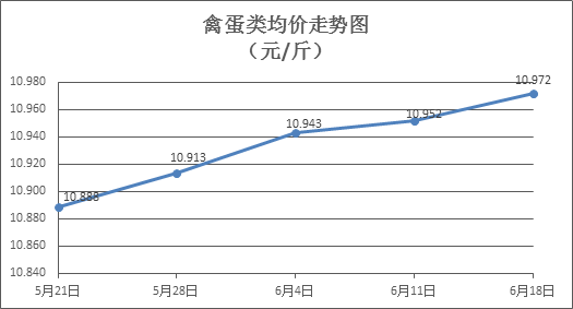 禽蛋類商品價格窄幅盤升。上周所監(jiān)測的6種禽蛋類商品價格波動情況為3漲3跌,綜合零售均價為10.972元/斤,環(huán)比上漲0.18%。其中:白條雞、白條鴨零售均價分別為每斤19.80元、15.65元,環(huán)比分別上漲0.25%、下降0.06%;白殼雞蛋、鴨蛋零售均價分別為每斤6.73元、7.94元,環(huán)比分別下降0.44%、上漲0.13%。