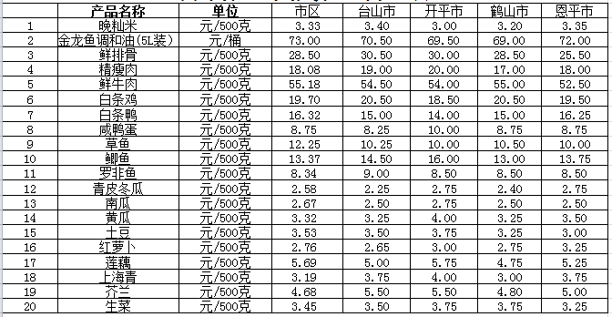 說明:1、表中價(jià)格為該地區(qū)監(jiān)測(cè)點(diǎn)綜合平均價(jià);2、“市區(qū)”含蓬江區(qū)、江海區(qū)、新會(huì)區(qū),價(jià)格分別采自蓬江市場、江南市場、城東市場等13家農(nóng)貿(mào)市場;3、其他四個(gè)縣市價(jià)格分別采自新華市場、錦江市場等8家農(nóng)貿(mào)市場。