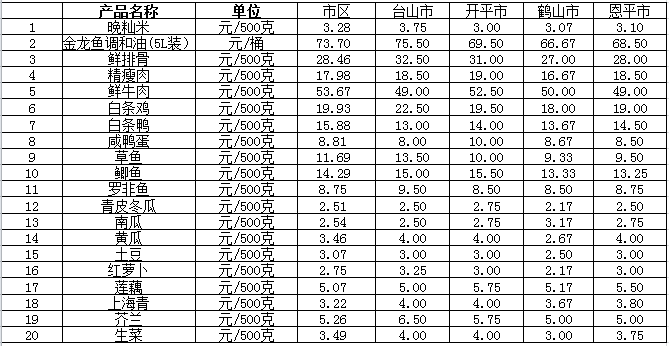 說明:1、表中價格為該地區(qū)監(jiān)測點綜合平均價;2、“市區(qū)”含蓬江區(qū)、江海區(qū)、新會區(qū),價格分別采自蓬江市場、江南市場、城東市場等13家農(nóng)貿(mào)市場;3、其他四個縣市價格分別采自新華市場、錦江市場等8家農(nóng)貿(mào)市場。
