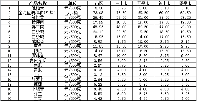 說明:1、表中價(jià)格為該地區(qū)監(jiān)測點(diǎn)綜合平均價(jià);2、“市區(qū)”含蓬江區(qū)、江海區(qū)、新會(huì)區(qū),價(jià)格分別采自蓬江市場、江南市場、城東市場等13家農(nóng)貿(mào)市場;3、其他四個(gè)縣市價(jià)格分別采自新華市場、錦江市場等8家農(nóng)貿(mào)市場。