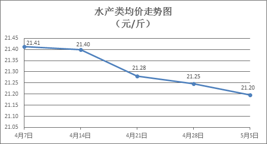 水產(chǎn)類商品價(jià)格總體微降。所監(jiān)測的10種水產(chǎn)商品價(jià)格波動(dòng)情況為2漲4跌4平,綜合均價(jià)為每斤21.20元,環(huán)比下降0.24%。其中:草魚、鯽魚、羅非魚、基圍蝦零售均價(jià)分別為每斤11.18元、14.25元、8.74元、32.73元,環(huán)比分別上漲0.27%、持平、下降0.57%、下降0.52%。