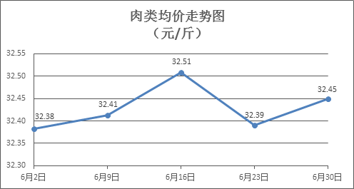 肉類商品價格微幅盤整。所監(jiān)測的8種肉類商品價格波動情況為5漲3跌,綜合零售均價為每斤32.45元,環(huán)比上漲0.18%。其中:排骨、精瘦肉、牛肉、帶骨羊肉零售均價分別為每斤30.23元、18.51元、46.31元、43.89元,環(huán)比分別上漲0.43%、下降0.32%、下降0.79%、上漲0.23%。