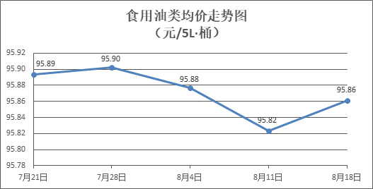 食用油類商品價(jià)格略有回升。所監(jiān)測(cè)的9種食用油(5L裝)商品價(jià)格波動(dòng)情況為4漲2跌3平,綜合零售均價(jià)為每桶95.86元,環(huán)比上漲0.04%。其中:胡姬花花生油、玉米油零售均價(jià)分別為每桶144.75元、77.54元,環(huán)比分別上漲0.23%、上漲0.13%。