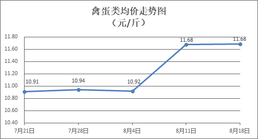 禽蛋類商品價(jià)格穩(wěn)中略漲。所監(jiān)測(cè)的5種禽蛋類商品價(jià)格波動(dòng)情況為3漲1跌1平,綜合零售均價(jià)為每斤11.68元,環(huán)比上漲0.05%。其中:白條雞、白條鴨零售均價(jià)分別為每斤20.02元、15.23元,環(huán)比分別上漲0.05%、上漲0.26%;白殼雞蛋、鴨蛋零售均價(jià)分別為每斤6.49元、7.68元,環(huán)比分別下降0.46%、上漲0.13%。