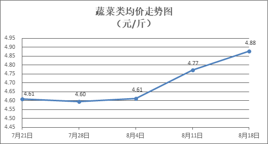 據(jù)本市21家農(nóng)貿(mào)市場(chǎng)監(jiān)測(cè)數(shù)據(jù)顯示,上周(8月12日至8月18日)市場(chǎng)上各類“菜籃子”商品供應(yīng)充足,所監(jiān)測(cè)的7大類“菜籃子”商品價(jià)格周環(huán)比6漲1跌。其中:糧食類商品價(jià)格基本平穩(wěn),食用油價(jià)格略有回升,蔬菜、豬肉類商品價(jià)格維持強(qiáng)勢(shì),禽蛋類、水產(chǎn)類、水果類商品價(jià)格窄幅盤整。受近期高溫和多雨天氣影響,上周葉菜類商品價(jià)格顯著走高。結(jié)合近期天氣及供應(yīng)情況,預(yù)計(jì)至9月上旬,蔬菜類商品價(jià)格仍將維持季節(jié)性強(qiáng)勢(shì)。