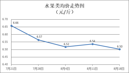 水果類商品價(jià)格漲跌互現(xiàn)。所監(jiān)測(cè)的6種水果商品價(jià)格波動(dòng)情況為3漲3跌,綜合零售均價(jià)為每斤6.50元,環(huán)比下降0.51%。其中橙子、葡萄、西瓜零售均價(jià)分別為每斤5.80元、13.41元、3.23元,環(huán)比分別上漲1.40%、下降2.61%、上漲1.57%。