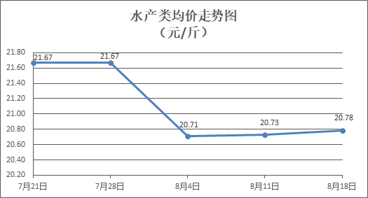 水產(chǎn)類商品窄幅盤整。所監(jiān)測(cè)的10種水產(chǎn)商品價(jià)格波動(dòng)情況為5漲2跌3平,綜合均價(jià)為每斤20.78元,環(huán)比上漲0.28%。其中:草魚、鰱魚、鱸魚、羅非魚、基圍蝦零售均價(jià)分別為每斤11.21元、9.58元、21.46元、8.93元、29.89元,環(huán)比分別持平、上漲1.16%、下降0.14%、持平、上漲1.05%。