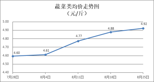蔬菜類商品價格總體略漲。所監(jiān)測的32 種蔬菜商品價格波動情況為22漲9跌1平,綜合零售均價為每斤4.92元,環(huán)比上漲0.88%。其中:漲幅居前的品種包括萵筍、西紅柿、青豆角,零售均價分別為每斤5.30元、5.06元、5.81元,環(huán)比分別上漲7.94%、5.86%、5.25%;跌幅靠前的品種包括黃瓜、絲瓜、苦瓜,零售均價分別為每斤4.46元、4.76元、5.19元,環(huán)比分別下降5.71%、5.37%、3.35%。