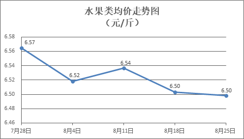 水果類商品價格小幅波動。所監(jiān)測的6種水果商品價格波動情況為2漲4跌,綜合零售均價為每斤6.50元,環(huán)比下降0.08%。其中橙子、葡萄、西瓜零售均價分別為每斤5.83元、13.37元、3.22元,環(huán)比分別上漲0.52%、下降0.30%、下降0.31%。