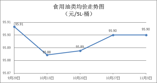 食用油類商品價(jià)格平穩(wěn)。所監(jiān)測(cè)的9種食用油(5L裝)商品價(jià)格均持平,綜合零售均價(jià)為每桶95.90元,環(huán)比持平。其中:金龍魚(yú)花生油、金龍魚(yú)調(diào)和油零售均價(jià)為每桶102.81元、71.29元,環(huán)比均持平。