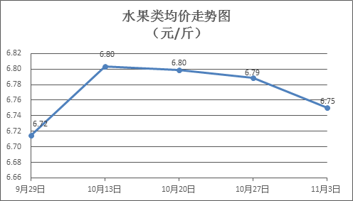 水果類商品價(jià)格有所下降。所監(jiān)測(cè)的6種水果商品價(jià)格波動(dòng)情況為2漲4跌,綜合零售均價(jià)為每斤6.75元,環(huán)比下降0.60%。其中橙子、蘋(píng)果、葡萄零售均價(jià)分別為每斤6.67元、7.42元、13.49元,環(huán)比分別下降0.55%、下降0.35%、上漲1.32%。