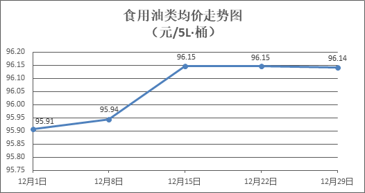 食用油類商品價(jià)格穩(wěn)中微降。所監(jiān)測(cè)的9種食用油(5L裝)商品價(jià)格波動(dòng)情況為1漲3跌5平,綜合零售均價(jià)為每桶96.14元,環(huán)比下降0.01%。其中:金龍魚(yú)花生油、大豆油零售均價(jià)為每桶103.14元、62.49元,環(huán)比分別下降0.06%、下降0.06%。