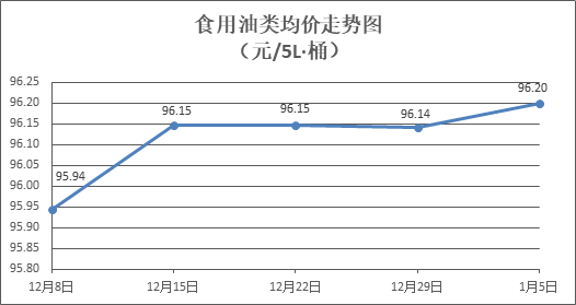 食用油類(lèi)商品價(jià)格穩(wěn)中略漲。所監(jiān)測(cè)的9種食用油(5L裝)商品價(jià)格波動(dòng)情況為4漲5平,綜合零售均價(jià)為每桶96.20元,環(huán)比上漲0.06%。其中:金龍魚(yú)花生油、金龍魚(yú)調(diào)和油零售均價(jià)為每桶103.14元、71.68元,環(huán)比分別持平、上漲0.15%。