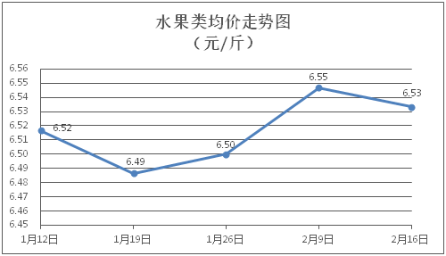 水果類商品價格微幅下降。所監(jiān)測的6種水果商品價格波動情況為1漲4跌1平,綜合零售均價為每斤6.53元,環(huán)比下降0.20%。其中橙子、香蕉、葡萄零售均價分別為每斤5.90元、3.18元、13.58元,環(huán)比分別上漲0.85%、下降1.24%、下降0.37%。