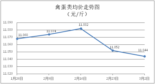 禽蛋類商品價(jià)格略有下降。所監(jiān)測(cè)的5種禽蛋類商品價(jià)格波動(dòng)情況為1漲3跌1平,綜合零售均價(jià)為每斤11.844元,環(huán)比下降0.07%。其中:白條雞、白條鴨零售均價(jià)分別為每斤20.56元、15.26元,環(huán)比分別下降0.10%、下降0.13%;雞蛋、鴨蛋零售均價(jià)分別為每斤6.59元、7.67元,環(huán)比分別下降0.30%、上漲0.26%。