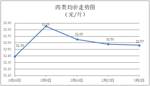 肉類商品價(jià)格總體微降。所監(jiān)測(cè)的8種肉類商品價(jià)格波動(dòng)情況為1漲5跌2平,綜合零售均價(jià)為每斤32.57元,環(huán)比下降0.05%。其中:排骨、精瘦肉、肋條肉、牛肉、帶骨羊肉零售均價(jià)分別為每斤31.49元、19.73元、16.69元、46.59元、41.38元,環(huán)比分別下降0.35%、持平、下降1.07%、持平、上漲0.72%。