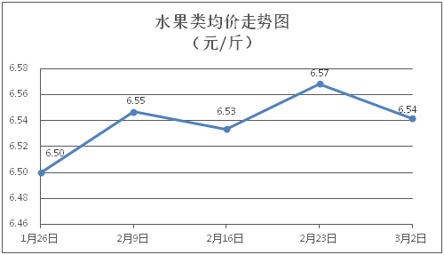 水果類商品價(jià)格小幅波動(dòng)。所監(jiān)測(cè)的6種水果商品價(jià)格波動(dòng)情況為3漲1跌2平,綜合零售均價(jià)為每斤6.54元,環(huán)比下降0.41%。其中蘋(píng)果、葡萄、西瓜零售均價(jià)分別為每斤7.49元、13.73元、3.47元,環(huán)比分別上漲0.13%、上漲0.37%、下降6.47%。