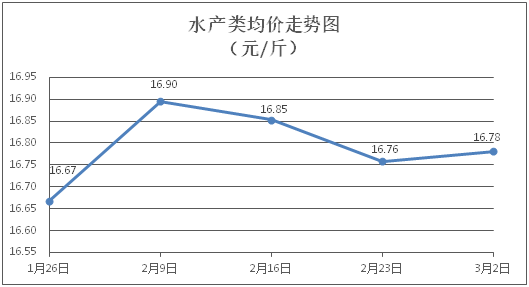 水產(chǎn)類商品價(jià)格弱勢(shì)盤(pán)整。所監(jiān)測(cè)的9種水產(chǎn)商品價(jià)格波動(dòng)情況為2漲4跌3平,綜合均價(jià)為每斤16.78元,環(huán)比上漲0.14%。其中:草魚(yú)、鯽魚(yú)、鳙魚(yú)、羅非魚(yú)、基圍蝦零售均價(jià)分別為每斤11.07元、14.30元、10.82元、9.13元、30.07元,環(huán)比分別下降0.18%、下降0.14%、上漲0.28%、下降0.65%、下降0.07%。