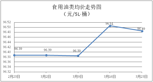 食用油類商品價(jià)格穩(wěn)中有降。所監(jiān)測的9種食用油(5L裝)商品價(jià)格波動(dòng)情況為5跌4平,綜合零售均價(jià)為每桶96.49元,環(huán)比下降0.02%。其中:魯花花生油、金龍魚調(diào)和油零售均價(jià)為每桶155.83元、72.07元,環(huán)比分別持平、下降0.06%。