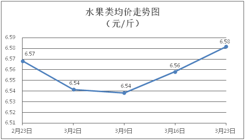 水果類商品價(jià)格微幅上漲。所監(jiān)測的6種水果商品價(jià)格波動(dòng)情況為3漲2跌1平,綜合零售均價(jià)為每斤6.58元,環(huán)比上漲0.36%。其中橙子、蘋果、葡萄零售均價(jià)分別為每斤6.14元、7.53元、13.78元,環(huán)比分別上漲2.16%、上漲0.27%、上漲0.22%。